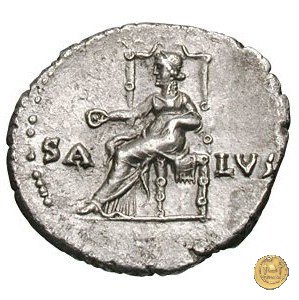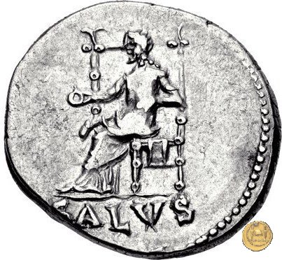 CLM66 Obverse: ![]() IMP NERO CAESAR ![]() AVGVSTVSTesta di Nerone con barba e laureata, rivolta verso destra. Reverse: → SALVS (esergo) La Salus, drappeggiata e rivolta verso sinistra, seduta su di un trono, con in mano una patera. | |