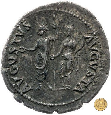 CLM55 Obverse: ![]() NERO CAESAR ![]() AVGVSTVSTesta di Nerone con barba e laureata, rivolta verso destra. Reverse: ![]() AVGVSTVS ![]() AVGVSTANerone, radiato e togato, in piedi verso sinistra con in mano uno scettro e una patera, accanto all'Imperatrice, velata e drappeggiata, con in mano una patera e due cornucopie. | |