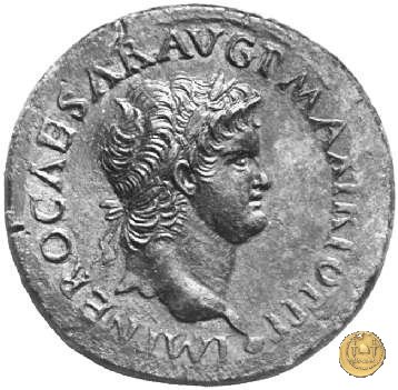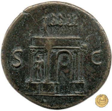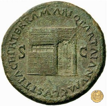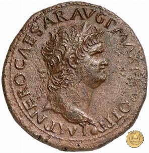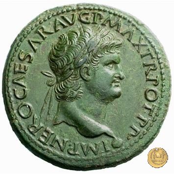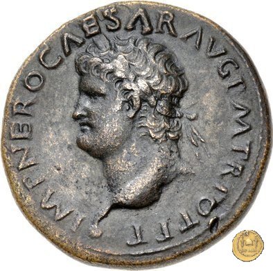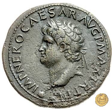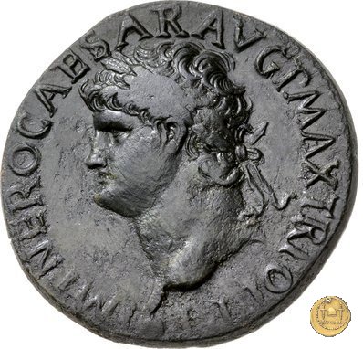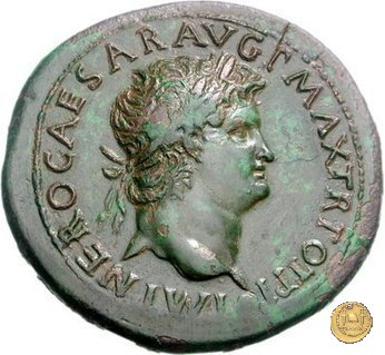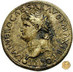 CLM255 Obverse: ↻ IMP NERO CAESAR AVG P MAX TR P P P Testa di Nerone laureata rivolta verso destra. Globo all'apice del busto. Reverse: → S - C Arco di trionfo addobbato con ghirlande, di fronte e lateralmente. Sopra di esso, l'Imperatore su di una quadriga, verso destra, scortato da una Vittoria, che tiene una ghirlanda e una palma e dalla Pax, con in mano un caduceo e una cornucopia. Sotto la quadriga, all'estrema sinistra e destra, due soldati di piccole dimensioni. Alla sinistra dell'arco, in una nicchia, Marte, con una lancia e uno scudo. Rilievi alla base dei plinti dell'arco. | |