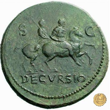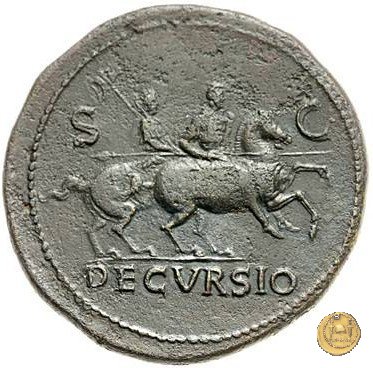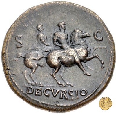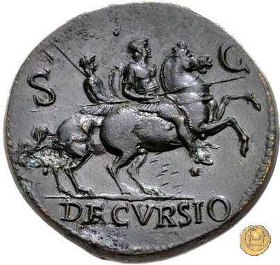 CLM262 Obverse: ↻ IMP NERO CAESAR AVG P MAX TR P P P Testa di Nerone laureata rivolta verso sinistra. Globo all'apice del busto. Reverse: → DECVRSIO (esergo); S - C Nerone, corazzato e con mantello sventolante, che galoppa verso destra su di un cavallo con in mano una lancia. Dietro di lui, un soldato che galoppa con un vessillo poggiato sulla spalla destra. | |