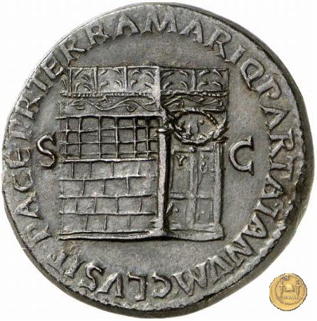 CLM267 Obverse: ↻ IMP NERO CAESAR AVG P MAX TR P P P Testa di Nerone laureata rivolta verso sinistra. Globo all'apice del busto. Reverse: ↻ PACE P R TERRA MARIQ PARTA IANVM CLVSIT; → S - C Prospetto frontale del tempio di Giano, con finestre sbarrate sulla sinistra e con porta a due ante chiusa, sulla destra. | |