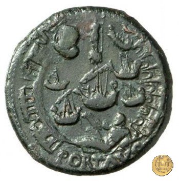 CLM270 Obverse: ↻ IMP NERO CAESAR AVG P MAX TR P P P Testa di Nerone laureata rivolta verso sinistra. Globo all'apice del busto. Reverse: ![]() PORT AVG; → S - CVisuale aerea del porto di Ostia. In alto, il faro, con su la statua di Nettuno, in piedi, con in mano uno scettro; in basso la figura del Tevere, distesa verso sinistra, con in mano un timone e un delfino; a sinistra un portico, che può variare nel numero delle colonne, terminante con una struttura preceduta da un sacrificio su di un altare; a destra dei frangiflutti, oppure approdi, terminanti in alto con un uomo seduto su di una roccia; al centro del porto, un numero variabile di barche, che possono andare da sette a piú di otto. | |