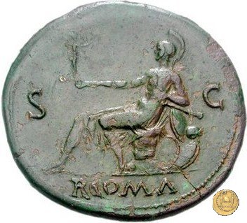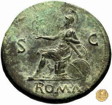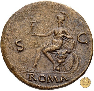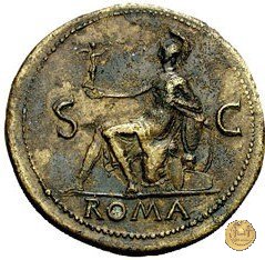 CLM276 Obverse: ↻ IMP NERO CAESAR AVG P MAX TR POT P P Testa di Nerone laureata rivolta verso destra. Globo all'apice del busto. Reverse: → ROMA (esergo); S - C Roma, elmata e in abbigliamento militare, seduta verso sinistra su di una corazza. Nella mano destra tiene una Vittoria e la sinistra è poggiata su di un parazonium; intorno alcuni scudi e armature. | |