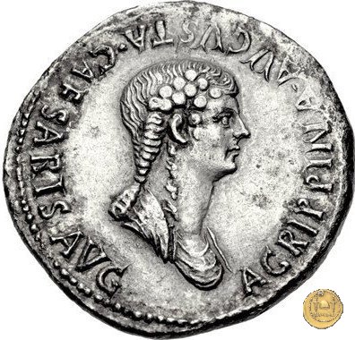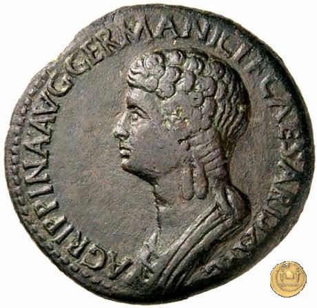 Busto di Agrippina minore, drappeggiato e con corona di spighe di grano, rivolto verso destra; i capelli sono raccolti in una lunga coda.