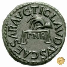 Claudio, togato, seduto verso sinistra su di una sella curule, con in mano un ramo e circondato da armi e armature.