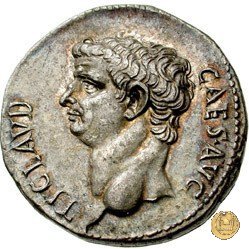 Claudio, togato e rivolto verso destra, che stringe la mano ad un soldato rivolto verso sinistra, con i capelli lunghi, uno scudo a tracolla e un'aquila sulla spalla.