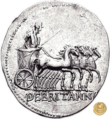 Claudio alla guida di una quadriga rivolta verso destra; in mano uno scettro con aquila.