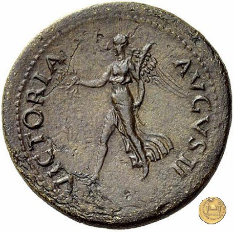 CLM284 Obverse: ↻ NERO CLAVD CAESAR AVG GER P M TR P IMP P P Testa di Nerone radiata rivolta verso destra. Reverse: ![]() VICTORIA ![]() AVGVSTIUna Vittoria che vola verso sinistra; nella mano destra una ghirlanda, nella sinistra una palma. | |