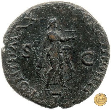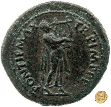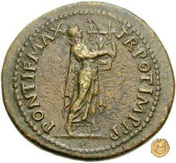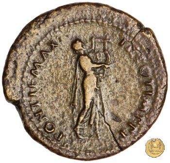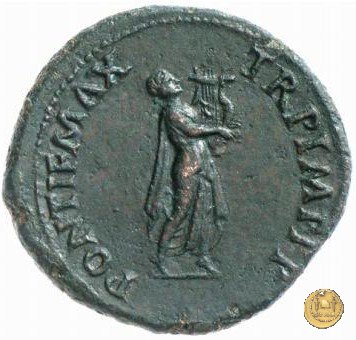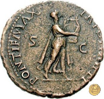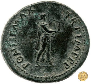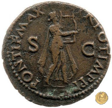 CLM448 Obverse: ↻ NERO CLAVD CAESAR AVG GERMANICV Testa di Nerone rivolta verso sinistra. Globo all'apice del busto. Reverse: ![]() PONTIF MAX ![]() TR POT IMP P P; → S - C; I (esergo)Nerone, laureato, che cammina verso destra nelle vesti di Apollo Citharoedus mentre suona una lira. | |