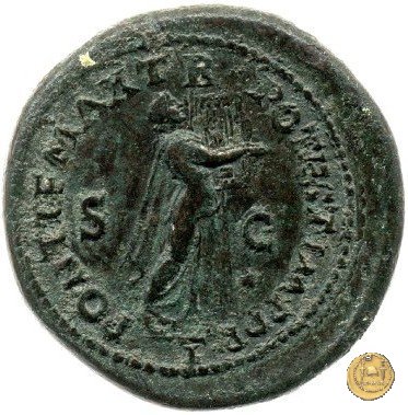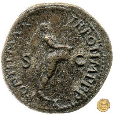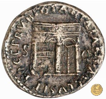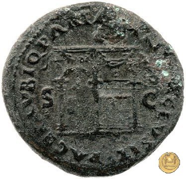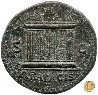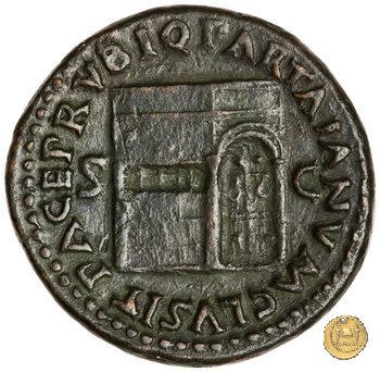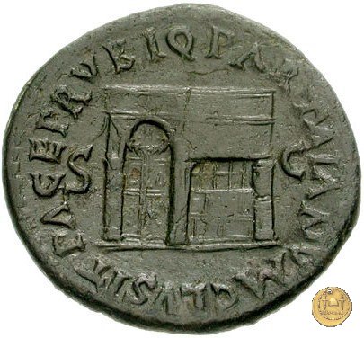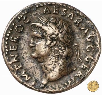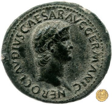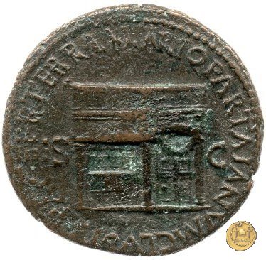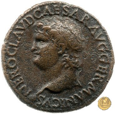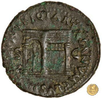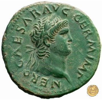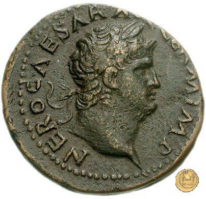 CLM480 Obverse: ↻ NERO CLAVD CAESAR AVG GER P M TR P IMP P P Testa di Nerone rivolta verso sinistra. Globo all'apice del busto. Reverse: ↻ PACE P R TERRA MARIQ PARTA IANVM CLVSIT; → S - C Prospetto frontale del tempio di Giano, con finestre sbarrate sulla sinistra e con porta a due ante chiusa, sulla destra. | |