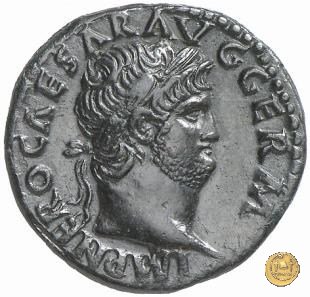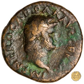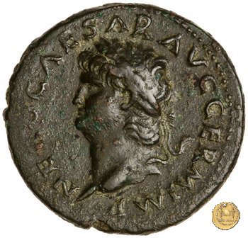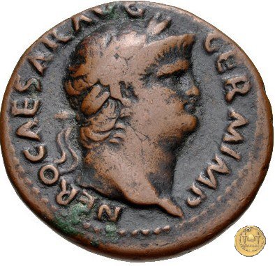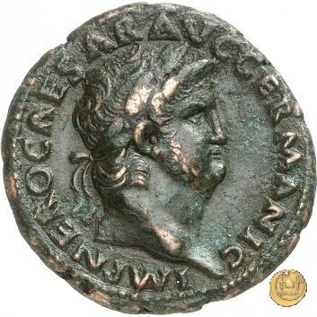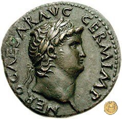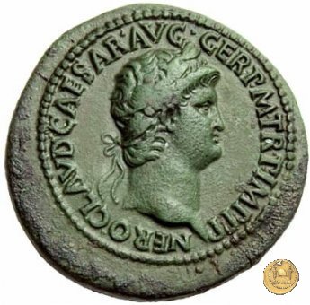 CLM416 Obverse: ↻ NERO CAESAR AVG GERM IMP Testa di Nerone laureata rivolta verso destra. Reverse: ↻ PACE P R TERRA MARIQ PARTA IANVM CLVSIT; → S - C Prospetto frontale del tempio di Giano, con finestre sbarrate sulla sinistra e con porta a due ante chiusa, sulla destra. | |