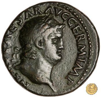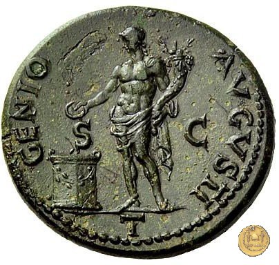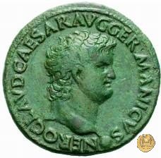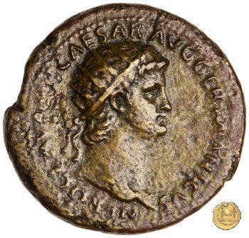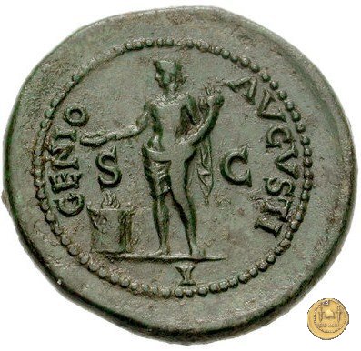 CLM410 Obverse: ↻ NERO CLAVD CAESAR AVG GER P M TR P IMP P P Testa di Nerone radiata rivolta verso destra. Reverse: ![]() GENIO ![]() AVGVSTI; → S - C; I (esergo)Il Genio, drappeggiato e in piedi verso sinistra. In mano una patera, tenuta sopra un altare e una cornucopia. | |