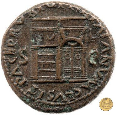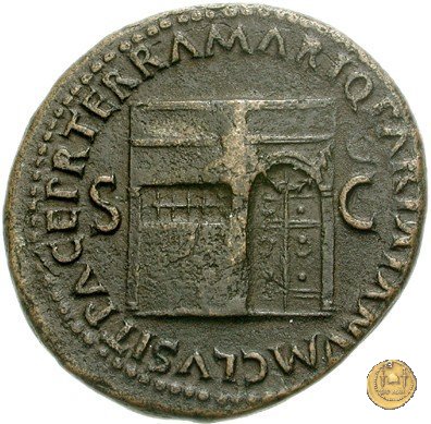 CLM418 Obverse: ↻ NERO CLAVD CAESAR AVG GER P M TR P IMP P P Testa di Nerone rivolta verso destra. Reverse: ↻ PACE P R TERRA MARIQ PARTA IANVM CLVSIT; → S - C Prospetto frontale del tempio di Giano, con finestre sbarrate sulla sinistra e con porta a due ante chiusa, sulla destra. | |