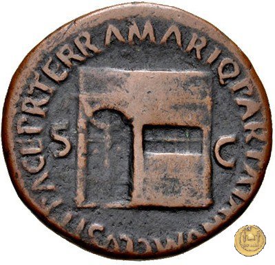 CLM476 Obverse: ↻ NERO CLAVD CAESAR AVG GER P M TR P IMP Testa di Nerone rivolta verso destra. Globo all'apice del busto. Reverse: ↻ PACE P R TERRA MARIQ PARTA IANVM CLVSIT; → S - C Prospetto frontale del tempio di Giano, con finestre sbarrate sulla sinistra e con porta a due ante chiusa, sulla destra. | |