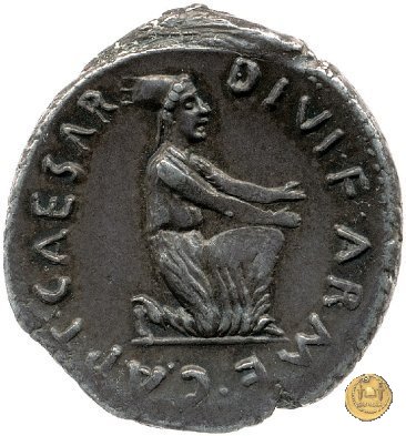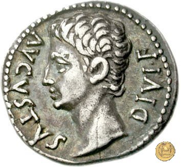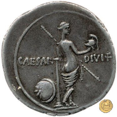 CLM327 Obverse: Testa di Ottaviano (Augusto) rivolta verso sinistra. Reverse: → CAESAR - DIVI F Venere, di spalle e con drappeggio alle gambe, poggiata su di una colonna. Nella mano destra tiene un elmetto e con la sinistra uno scettro in posizione trasversale. Poggiato alla colonna, uno scudo con su disegnata una stella a otto raggi. | |