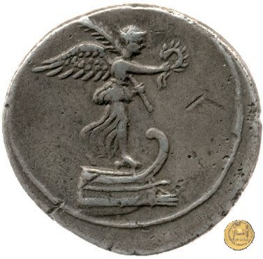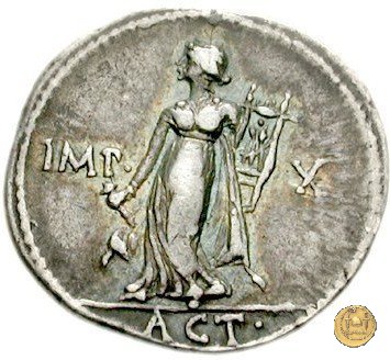 CLM337 Obverse: Una Vittoria, drappeggiata e rivolta verso destra, sulla prua di una nave. Nella mano destra una ghirlanda, nella sinistra una palma. Reverse: → IMP CAESAR (esergo) Ottaviano (Augusto) alla guida di una quadriga con carro ornato. Con la mano destra tiene un ramo, con la sinistra le briglie. | |
