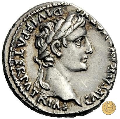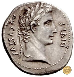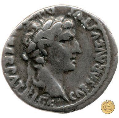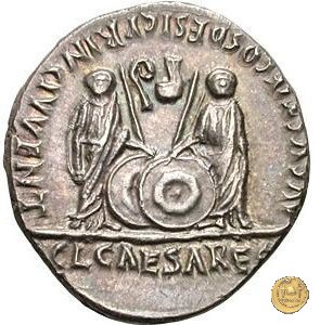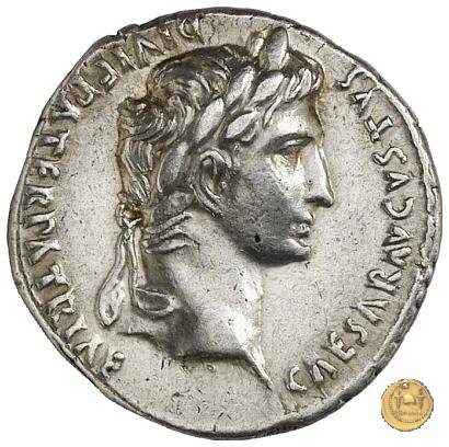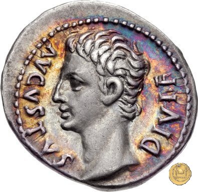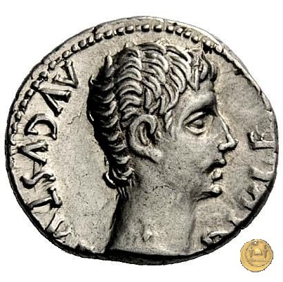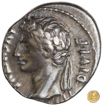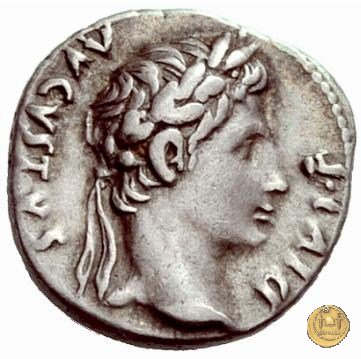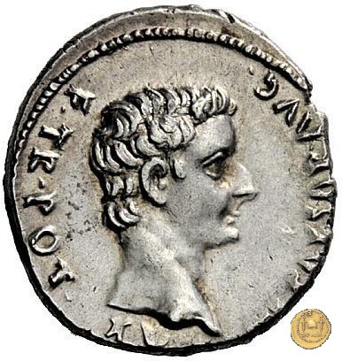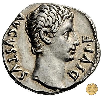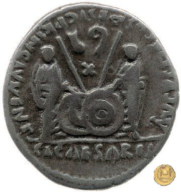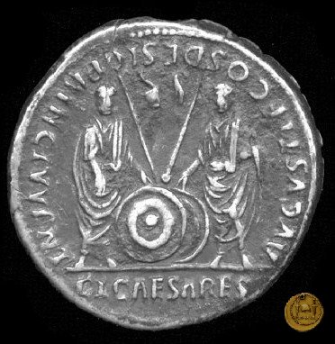 CLM319 Obverse: ![]() CAESAR AVGVSTVS ![]() DIVI F PATER PATRIAETesta di Augusto, laureata, rivolta verso destra. Reverse: ↺ AVGVSTI F COS DESIG PRINC IVVENT; C L CAESARES (esergo) Caio Cesare e Lucio Cesare, in piedi e togati, tengono ognuno una mano su di uno scudo davanti a loro; dietro ogni scudo c'è una lancia; sopra di loro, a sinistra, un lituus rivolto verso destra e a destra un simpulum rivolto verso sinistra. | |