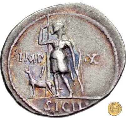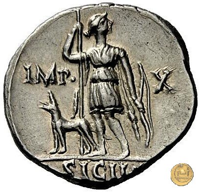 CLM295 Obverse: ![]() AVGVSTVS ![]() DIVI FTesta di Augusto rivolta verso sinistra. Reverse: → IMP - X; SICIL (esergo) Diana, in piedi rivolta verso sinistra ma con la testa verso destra, con una vesta da cacciatrice. Nella mano destra tiene una lancia, nella sinistra, un arco. Ai suoi piedi, un cane rivolto verso sinistra. | |