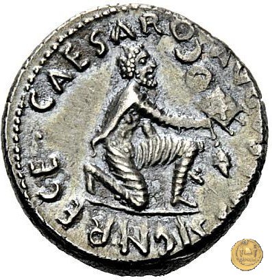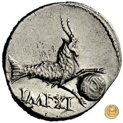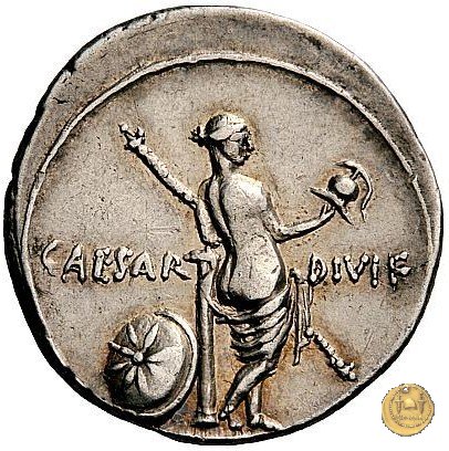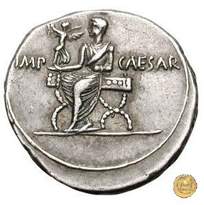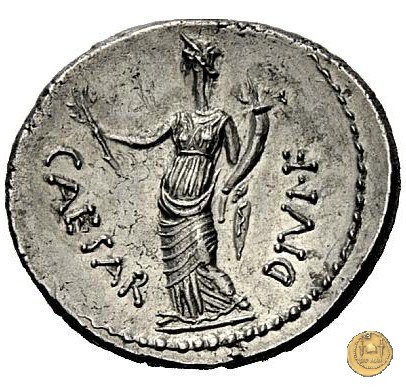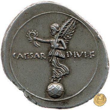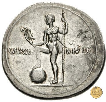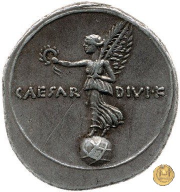 CLM334 Obverse: Busto di una Vittoria, ad ali spiegate, rivolto verso destra. Reverse: → CAESAR - DIVI F Una figura maschile (Nettuno?), nuda ma con mantello, rivolta verso sinistra con il piede sinistro su di un globo. Nella mano destra un aplustre, nella sinistra uno scettro. | |