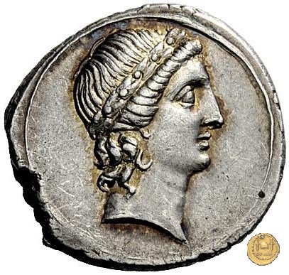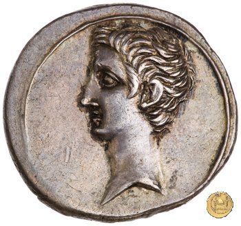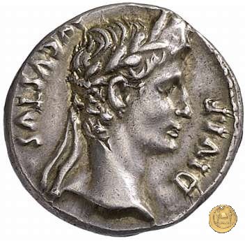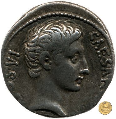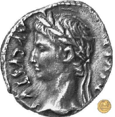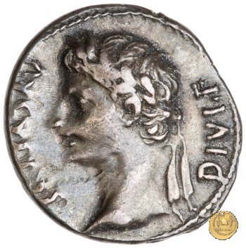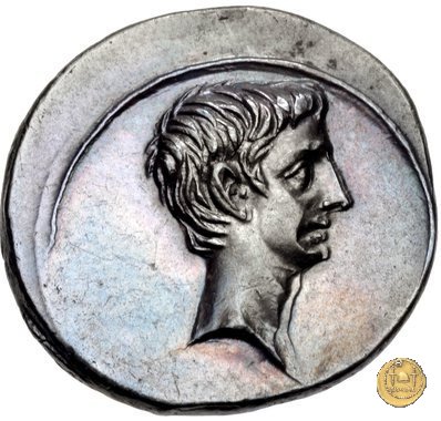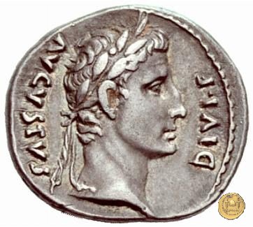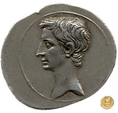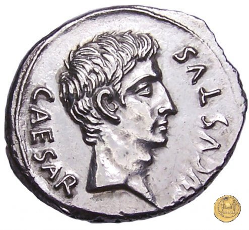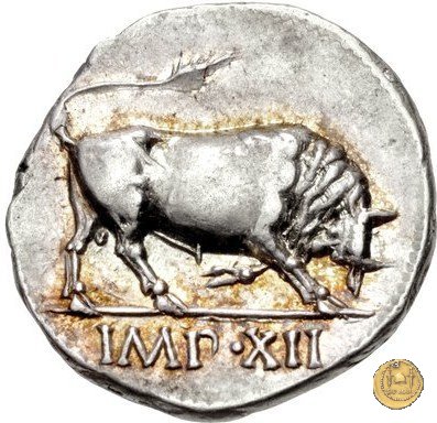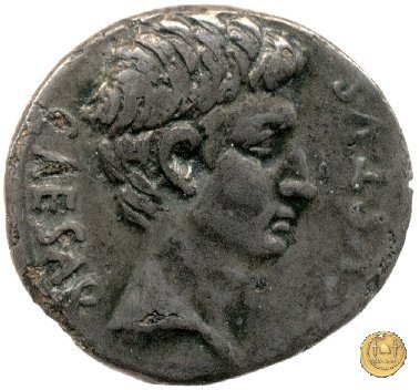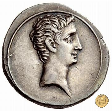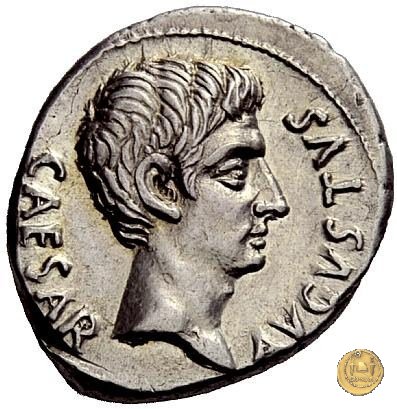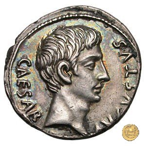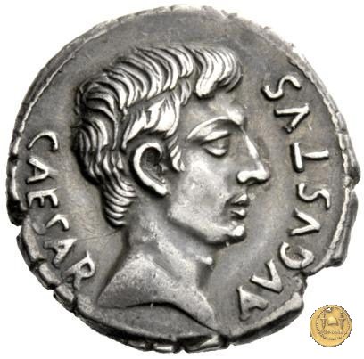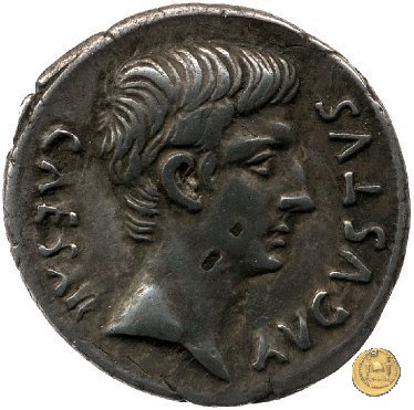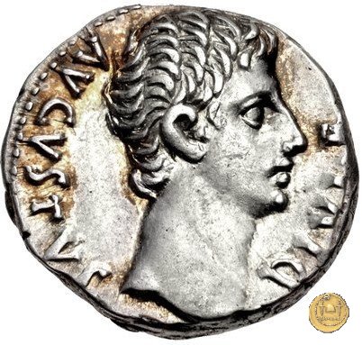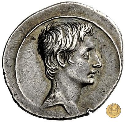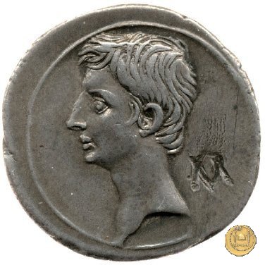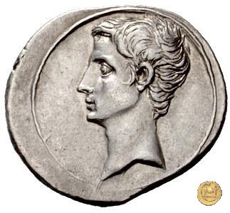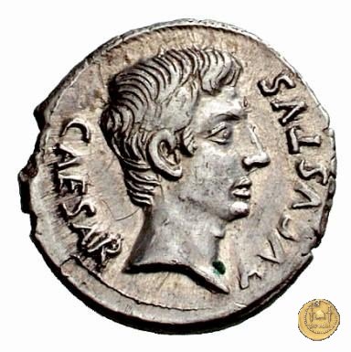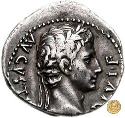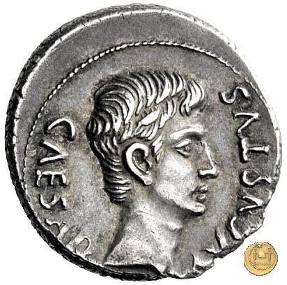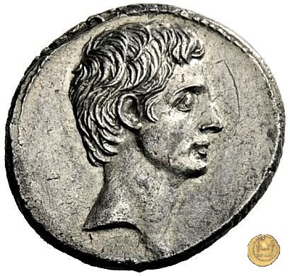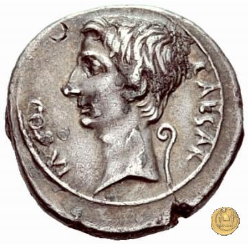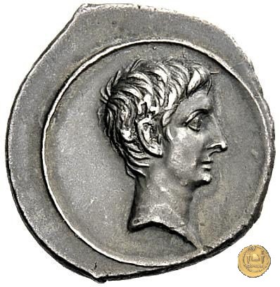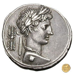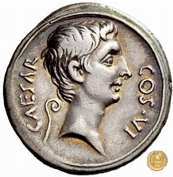 CLM346 Obverse: Testa di Apollo, laureata, rivolta verso destra. Reverse: → IMP CAESAR (esergo) Ottaviano (Augusto), velato e laureato, che ara un campo con due buoi, rivolto verso destra. Con la mano sinistra tiene una frusta. | |