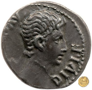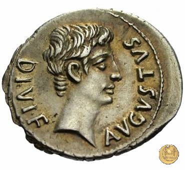 CLM333 Obverse: Testa di Ottaviano (Augusto) rivolta verso sinistra. Reverse: → CAESAR - DIVI F Una Vittoria, drappeggiata, in piedi su di un globo, rivolta verso destra. Nella mano destra una ghirlanda, nella sinistra una palma. | |