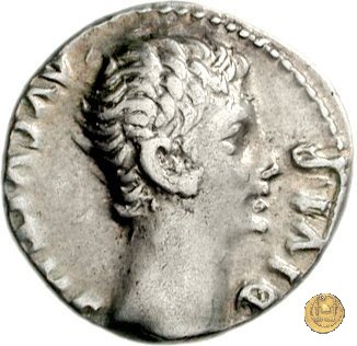 CLM326 Obverse: Testa di Ottaviano (Augusto) rivolta verso destra. Reverse: → CAESAR - DIVI F Venere, di spalle e con drappeggio alle gambe, poggiata su di una colonna. Nella mano destra tiene un elmetto e con la sinistra uno scettro in posizione trasversale. Poggiato alla colonna, uno scudo con su disegnata una stella a otto raggi. | |