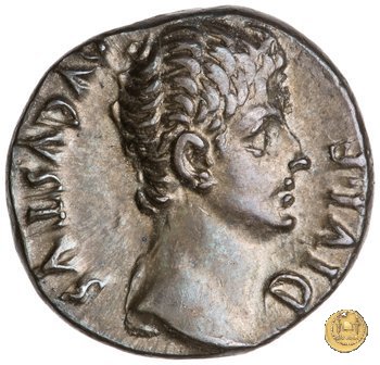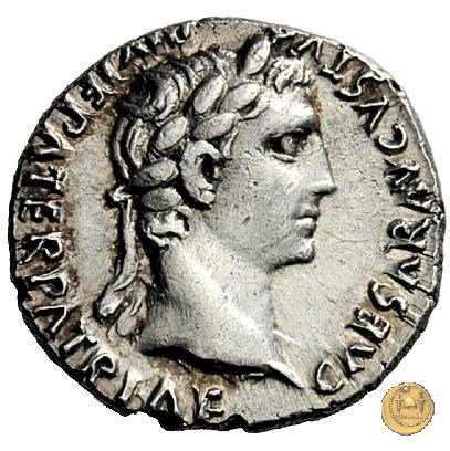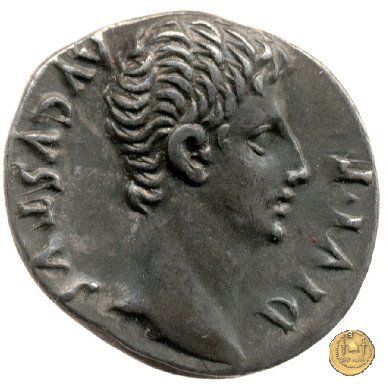 CLM321 Obverse: ![]() CAESAR AVGVSTVS ![]() DIVI F PATER PATRIAETesta di Augusto, laureata, rivolta verso destra. Reverse: ↺ AVGVSTI F COS DESIG PRINC IVVENT; C L CAESARES (esergo); X Caio Cesare e Lucio Cesare, in piedi e togati, tengono ognuno una mano su di uno scudo davanti a loro; dietro ogni scudo c'è una lancia; sopra di loro, a sinistra, un lituus rivolto verso destra e a destra un simpulum rivolto verso sinistra. | |