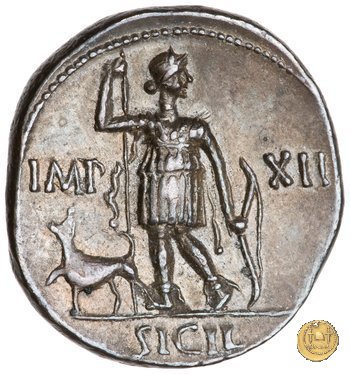 CLM302 Obverse: ![]() AVGVSTVS ![]() DIVI FTesta di Augusto rivolta verso destra. Reverse: → IMP - XII; SICIL (esergo) Diana, in piedi rivolta verso sinistra ma con la testa verso destra, con una vesta da cacciatrice. Nella mano destra tiene una lancia, nella sinistra, un arco. Ai suoi piedi, un cane rivolto verso sinistra. | |