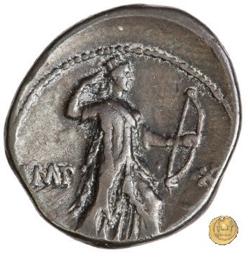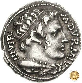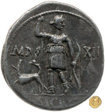 CLM383 Obverse: ![]() M DVRMIVS ![]() IIIVIRTesta di Ercole, diademata e drappeggiata con pelle di leone, rivolta verso destra. Sopra la spalla, una clava. Reverse: ↻ CAESAR - AVGVSTVS SIGN RECE; X Un partico in ginocchioni rivolto verso destra. Con la mano destra tiene uno stendardo con un vessillo iscritto. | |