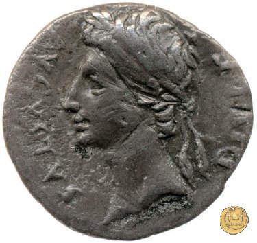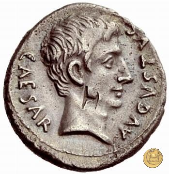 CLM328 Obverse: Busto drappeggiato di Venere, con diadema e collana, rivolto verso destra. Reverse: → CAESAR - DIVI F Ottaviano (Augusto), in abbigliamento militare e mantello sventolante, che avanza verso sinistra. La mano destra è estesa mentre con la mano sinistra tiene una lancia. | |