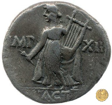 CLM309 Obverse: ![]() AVGVSTVS ![]() DIVI FTesta di Augusto, laureata, rivolta verso destra. Reverse: → IMP - XII; ACT (esergo) Apollo Citharoedus (Citaredo), drappeggiato, in piedi verso destra. La mano destra è tesa (con un plettro?) e la sinistra tiene una lira. | |