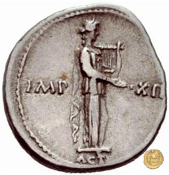 CLM310 Obverse: ![]() AVGVSTVS ![]() DIVI FTesta di Augusto, laureata, rivolta verso sinistra. Reverse: → IMP - XII; ACT (esergo) Apollo Citharoedus (Citaredo), drappeggiato, in piedi verso destra. La mano destra è tesa (con un plettro?) e la sinistra tiene una lira. | |