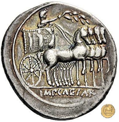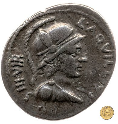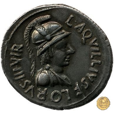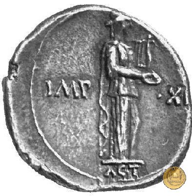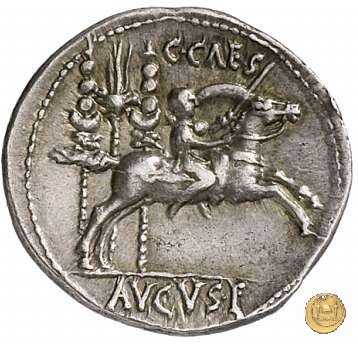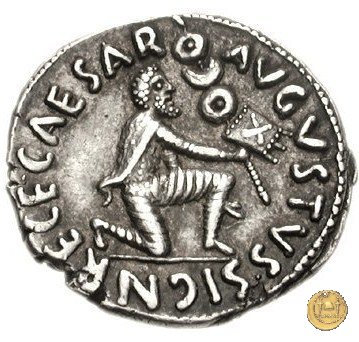 CLM376 Obverse: ↻ L AQVILLIVS FLORVS IIIVIR Busto della Virtus, drappeggiato e con elmo con pennacchio, rivolto verso destra. Reverse: ↻ CAESAR - AVGVSTVS SIGN RECE; X Un partico in ginocchioni rivolto verso destra. Con la mano destra tiene uno stendardo con un vessillo iscritto. | |