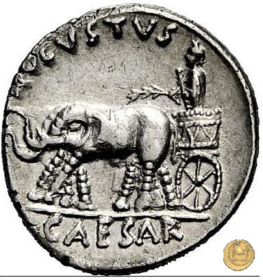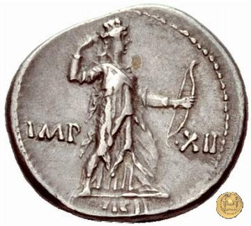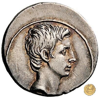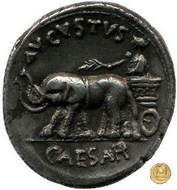 CLM354 Obverse: ![]() P PETRON TVRP ![]() ILIAN IIIVIRTesta di Libero, incoronata d'edera, rivolta verso destra. Reverse: ![]() AVGVSTVS → CAESAR (esergo)Augusto, su una biga di elefanti, rivolto verso sinistra. Con la mano destra tiene un ramo di alloro, con la sinistra uno scettro. | |