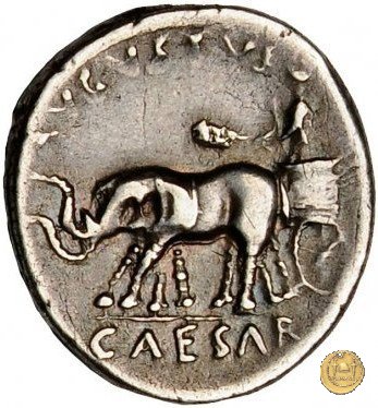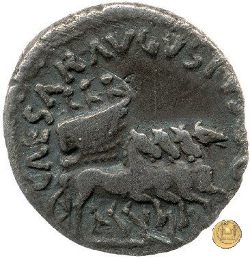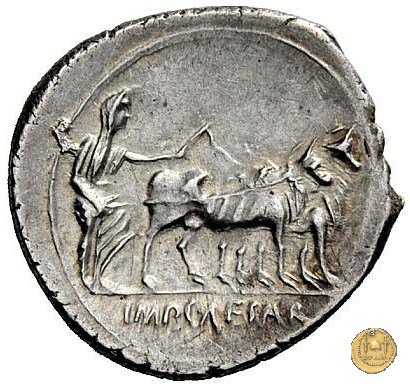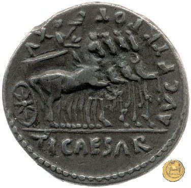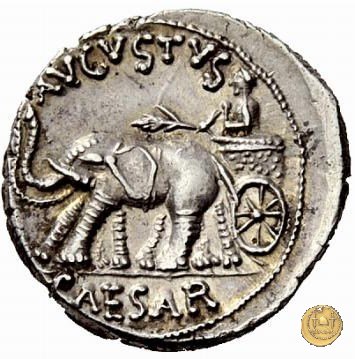 CLM372 Obverse: ↻ L AQVILLIVS FLORVS IIIVIR Busto della Virtus, drappeggiato e con elmo con pennacchio, rivolto verso destra. Reverse: ![]() AVGVSTVS → CAESAR (esergo)Augusto, su una biga di elefanti, rivolto verso sinistra. Con la mano destra tiene un ramo di alloro, con la sinistra uno scettro. | |