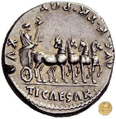 CLM323 Obverse: ![]() CAESAR AVGVSTVS ![]() DIVI F PATER PATRIAETesta di Augusto, laureata, rivolta verso destra. Reverse: ![]() TI CAESAR ![]() AVG F TR POT - XVTiberio, laureato e in piedi verso destra su una quadriga trionfale. Nella mano destra tiene una ghirlanda e nella sinistra uno scettro con testa ad aquila. Le teste dei cavalli sono tutte rivolte verso destra. | |