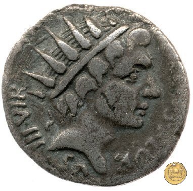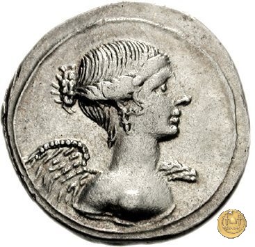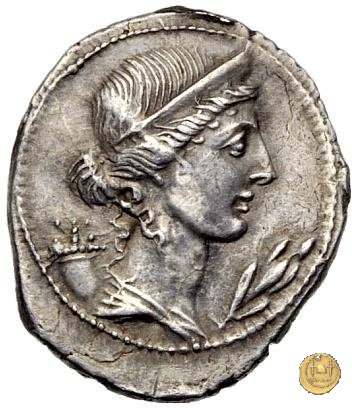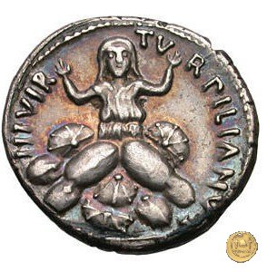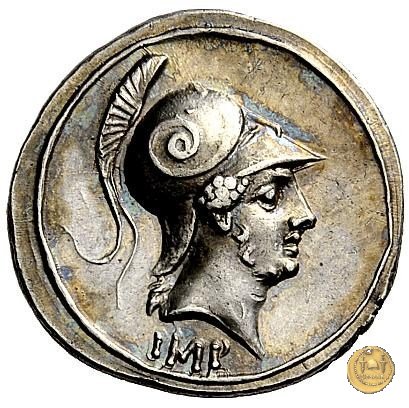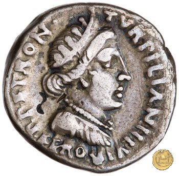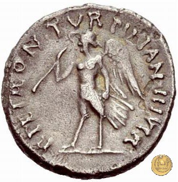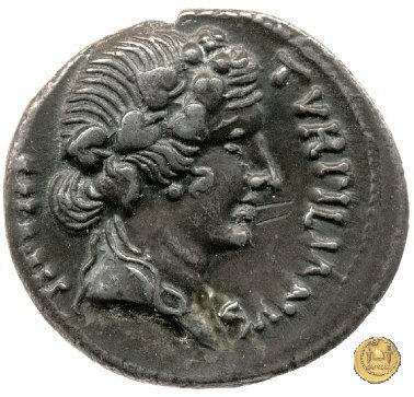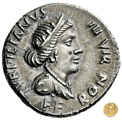 CLM357 Obverse: ![]() TVRPILIANVS ![]() IIIVIR FE - RONBusto di Feronia, diademato e drappeggiato, rivolto verso destra. Reverse: ↻ CAESAR - AVGVSTVS SIGN RECE; X Un partico in ginocchioni rivolto verso destra. Con la mano destra tiene uno stendardo con un vessillo iscritto. | |