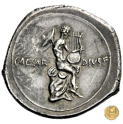 CLM335 Obverse: Testa di Ottaviano (Augusto) rivolta verso destra. Reverse: → CAESAR - DIVI F Una figura maschile, nuda, seduta su di un mantello su una roccia, rivolta verso destra e intenta a suonare una lira. Al collo ha appeso un petasus. | |