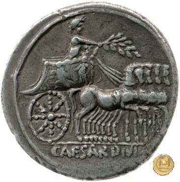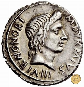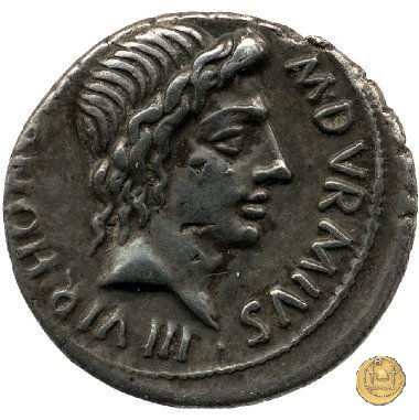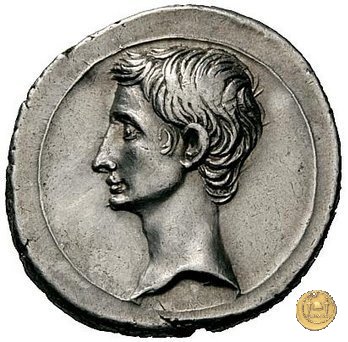 CLM381 Obverse: ![]() M DVRMIVS ![]() IIIVIR HONORITesta di Honos rivolta verso destra. Reverse: ![]() AVGVSTVS → CAESAR (esergo)Augusto, su una biga di elefanti, rivolto verso sinistra. Con la mano destra tiene un ramo di alloro, con la sinistra uno scettro. | |