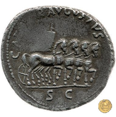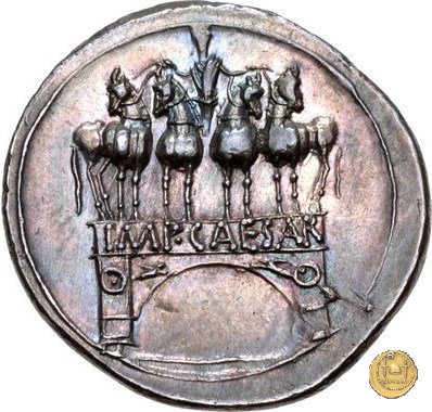 CLM341 Obverse: Testa di Ottaviano (Augusto) rivolta verso destra. Reverse: → IMP CAESAR Un arco di trionfo con architrave inscritto e decorato con Vittorie e scudi. Sopra di esso Ottaviano (Augusto) al comando di una quadriga in posizione frontale. | |
