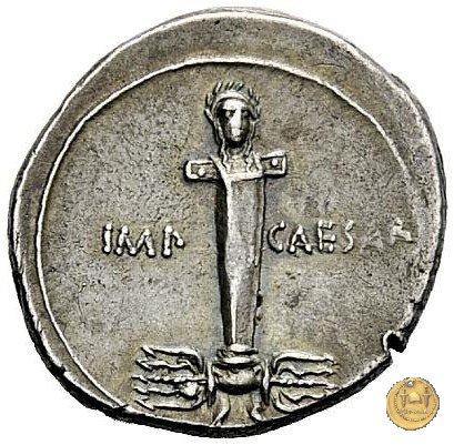 CLM342 Obverse: Testa di Ottaviano (Augusto) rivolta verso destra. Reverse: → IMP - CAESAR Una colonna antropomorfa, con in cima una testa laureata (Terminus?), posta al di sopra di un fulmine alato. | |