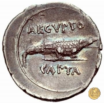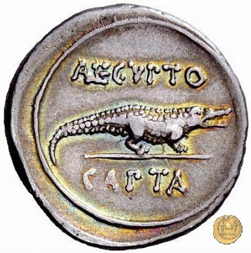 CLM348 Obverse: ![]() CAESAR ![]() COS VITesta di Ottaviano (Augusto) rivolta verso destra. Dietro di lui un lituus. Reverse: → AEGVPTO / CAPTA Un coccodrillo rivolto verso destra. | |