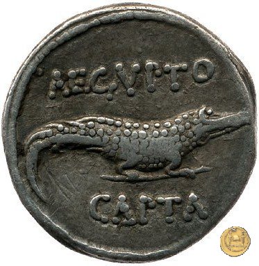 CLM349 Obverse: ![]() CAESAR ![]() COS VITesta di Ottaviano (Augusto) rivolta verso sinistra. Dietro di lui un lituus. Reverse: → AEGVPTO / CAPTA Un coccodrillo rivolto verso destra. | |