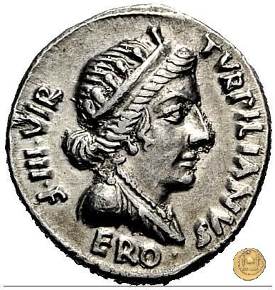 CLM352 Obverse: ![]() TVRPILIANVS ![]() IIIVIR ![]() FER - OBusto di Feronia, diademato e drappeggiato, rivolto verso destra. Reverse: ![]() AVGVSTVS → CAESAR (esergo)Augusto, su una biga di elefanti, rivolto verso sinistra. Con la mano destra tiene un ramo di alloro, con la sinistra uno scettro. | |
