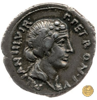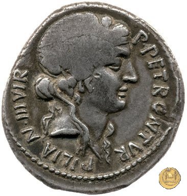 CLM359 Obverse: ![]() P PETRON ![]() TVRPILIAN IIIVIR ![]() FEROBusto di Feronia, diademato e drappeggiato, rivolto verso destra. Reverse: ↻ CAESAR - AVGVSTVS SIGN RECE; X Un partico in ginocchioni rivolto verso destra. Con la mano destra tiene uno stendardo con un vessillo iscritto. | |