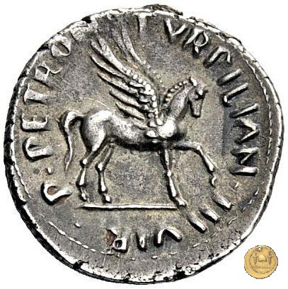 CLM367 Obverse: ![]() CAESAR ![]() AVGVSTVSTesta di Augusto rivolta verso destra. Reverse: ↻ P PETRON TVRPILIAN III VIR Pegaso che avanza verso destra. | |