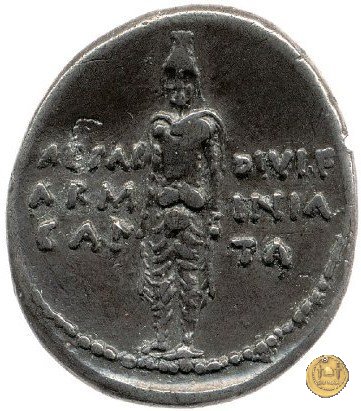 CLM378 Obverse: ↻ L AQVILLIVS - FLORV - S IIIVIR Busto della Virtus, drappeggiato e con elmo con pennacchio, rivolto verso destra. Reverse: → CAESAR - DIVI F / ARM - INIA / CAP - TA Un guerriero armeno, con tiara e mantello, in piedi rivolto frontalmente. | |