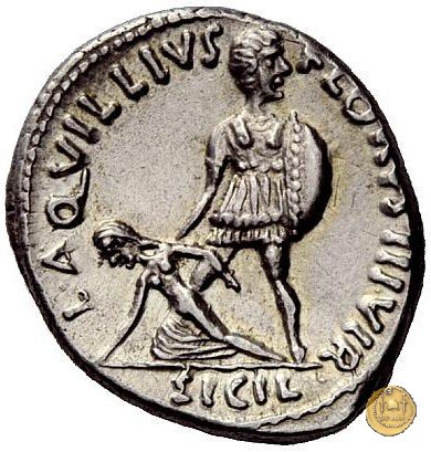 CLM380 Obverse: ![]() CAESAR ![]() AVGVSTVSTesta di Augusto rivolta verso destra. Reverse: ↻ L AQVILLIVS - FLORVS IIIVIR; → SICIL (esergo) Un guerriero con scudo, in piedi frontalmente ma con testa rivolta verso destra, che tiene per un braccio una donna a terra (Sicilia). | |