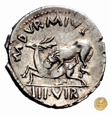 CLM384 Obverse: ![]() M DVRMIVS ![]() IIIVIR HONORITesta di Honos rivolta verso destra. Reverse: ↻ CAESAR - AVGVSTVS SIGN RECE; X Un partico in ginocchioni rivolto verso destra. Con la mano destra tiene uno stendardo con un vessillo iscritto. | |