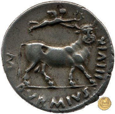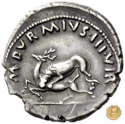 CLM387 Obverse: ![]() CAESAR ![]() AVGVSTVSTesta di Augusto rivolta verso destra. Reverse: ↺ M - DVRMIVS - IIIVIR Una Vittoria, che vola verso destra, intenta ad incoronare un toro con la testa umana, anch'esso rivolto verso destra. | |